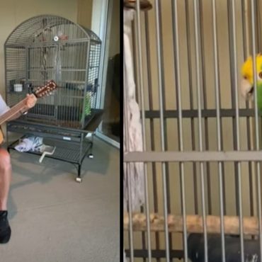 Ένας άνδρας παίζει στην κιθάρα το “Stairway to Heaven” και ο παπαγάλος προσπαθεί να μιμηθεί τη φωνή του Robert Plant των Led Zeppelin.